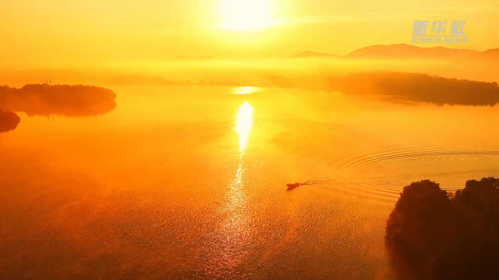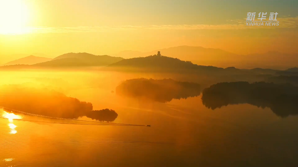 近日,安徽省池州市齐山平天湖风景区,晨雾如轻纱般在湖面缓缓流淌,远山如黛,近水含烟。