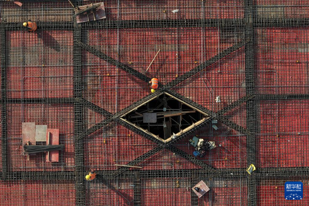 11月30日,工人在淮宿蚌城际铁路淮北西站站前广场项目施工现场作业(无人机照片)。