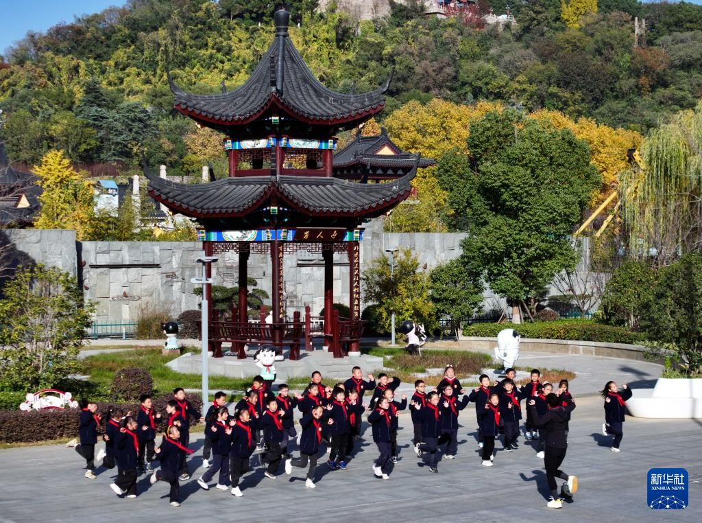 11月28日,在位于南京市鼓楼区的天妃宫小学,学生在上体育舞蹈课(无人机照片)。
