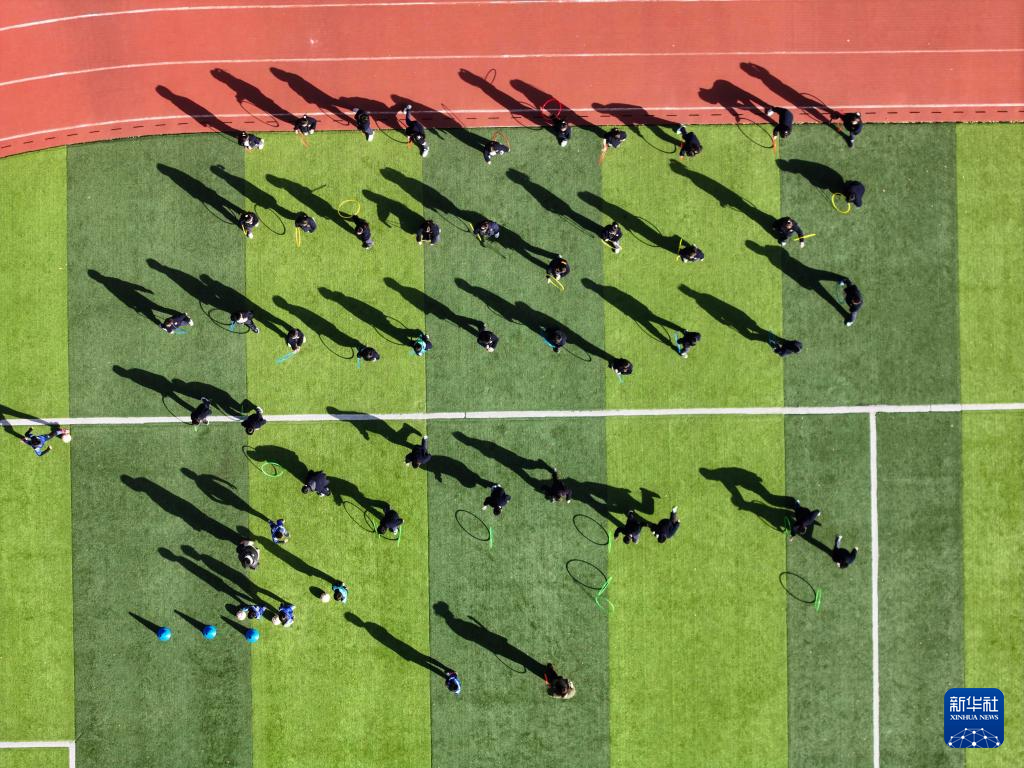 11月28日,在位于南京市鼓楼区的天妃宫小学,学生在上体适能课(无人机照片)。