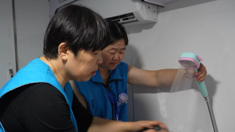 这是一辆公益助浴车。它为行动不便或家中缺乏洗浴设施的老人提供助浴服务。每位老人在洗浴前,都会经过测量血压、询问健康情况等环节,确保身体适合沐浴。