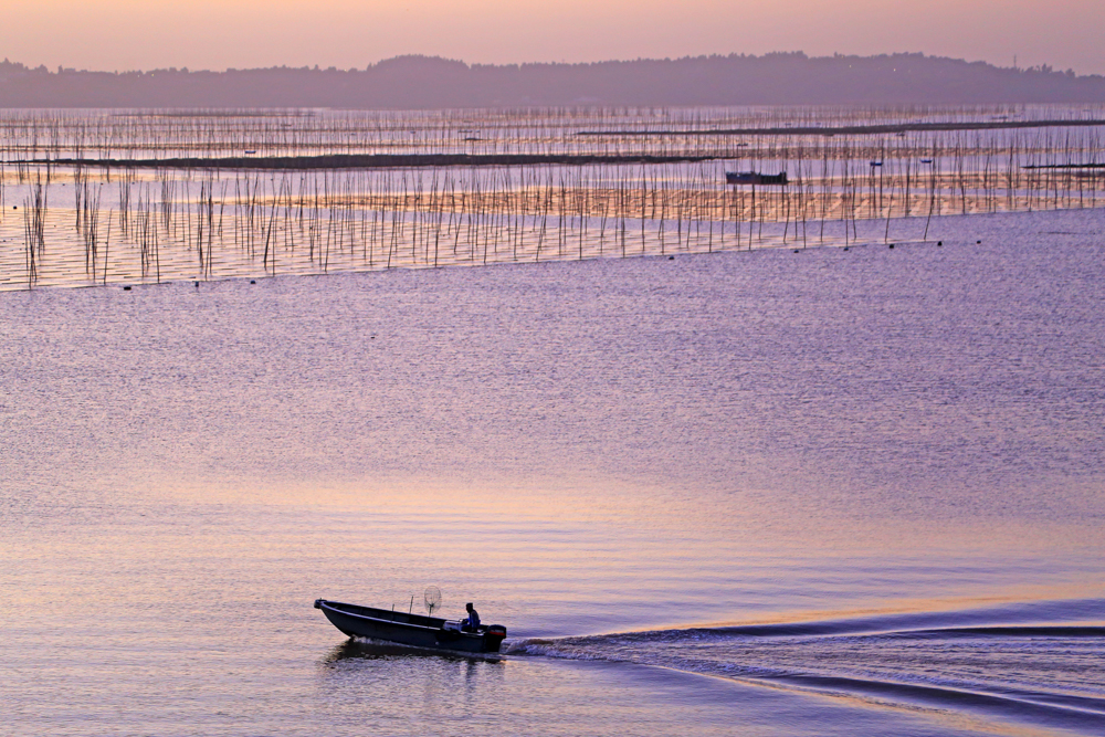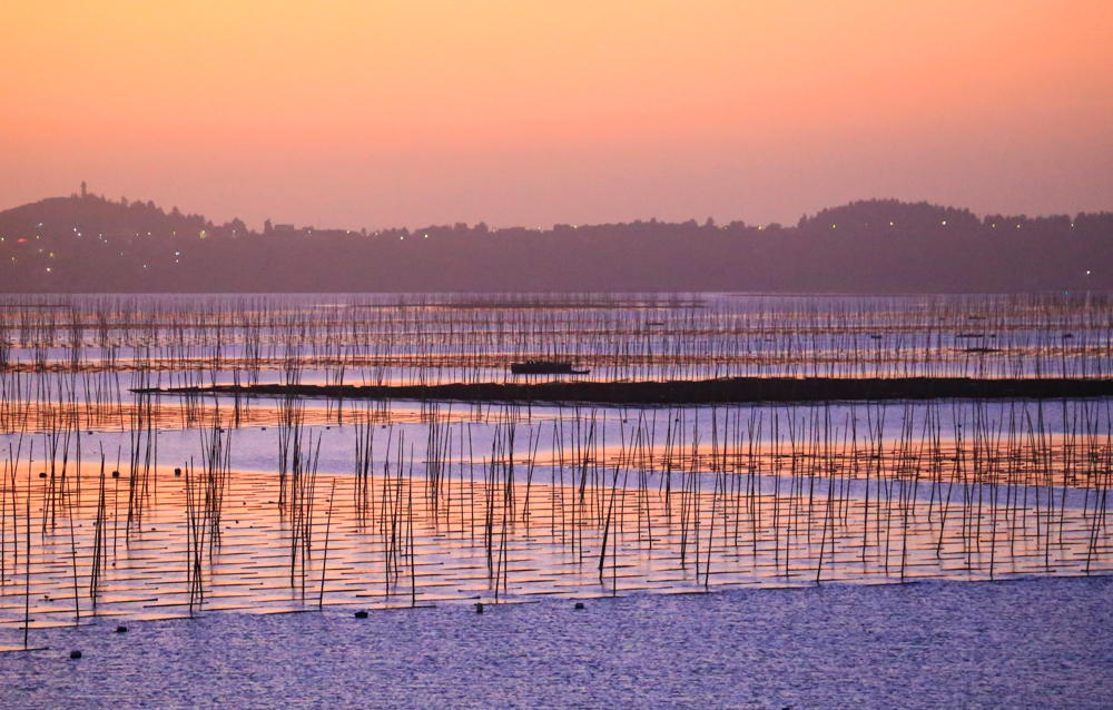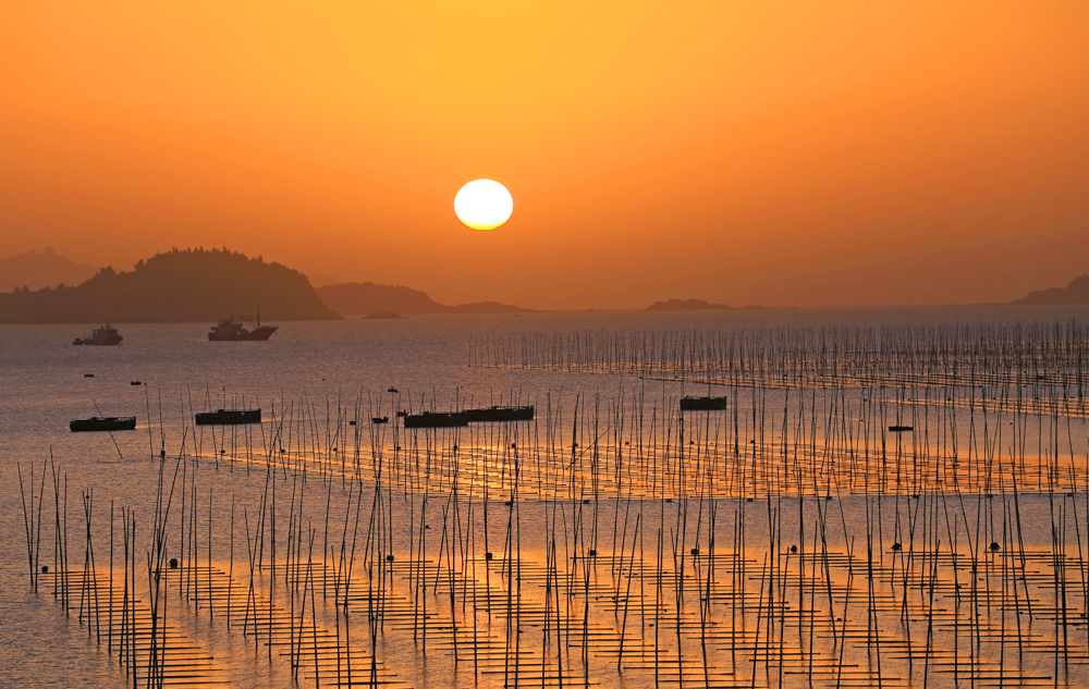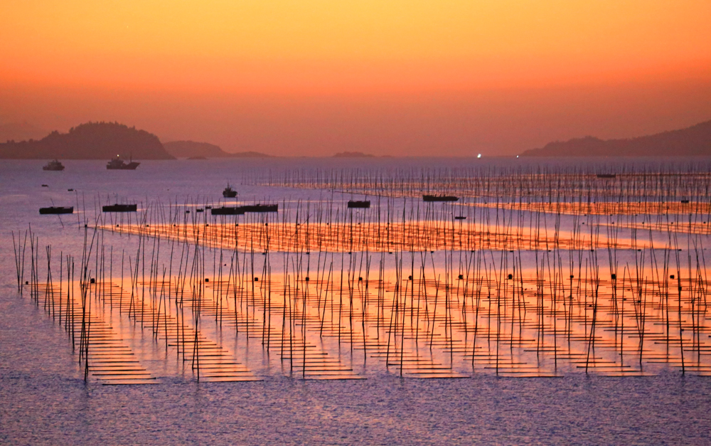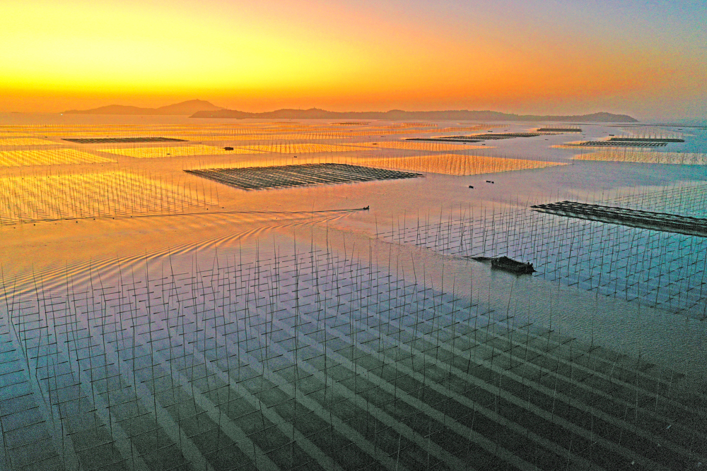 近日,在浙江省玉环市干江镇下礁门村浅海域“海上菜园”,渔民们抓住晴好天气采收紫菜,与远山、朝阳、海湾共同勾勒出一幅“海上田园”生态画卷。