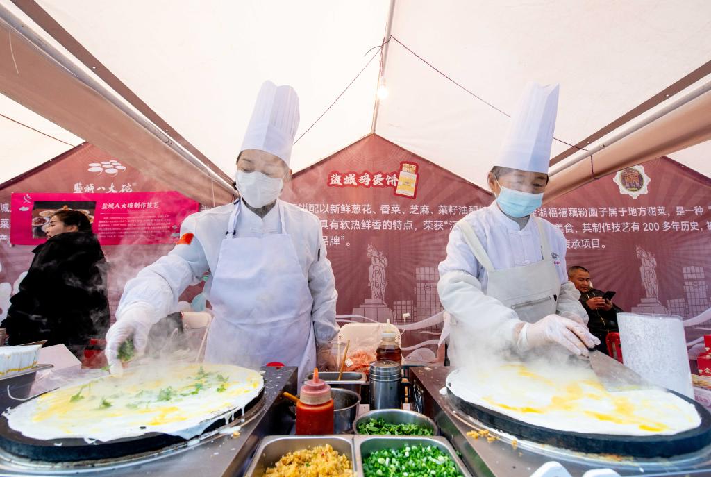 12月6日,商家在江苏省靖江市长江文化中心活动现场制作“苏味”食品。