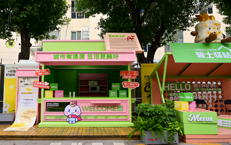 以服务新就业群体为切口,邻里中心党委推动党建资源向项目一线下沉,将党群服务阵地嵌入商圈运营的关键节点。目前,园区已建成多处“骑士驿站”,配置饮水、充电、应急药箱、阅读角等基础设施,并结合不同场景开展便民服务,努力解决骑手工作中的现实困难,增强其在城市中的归属感与获得感。
