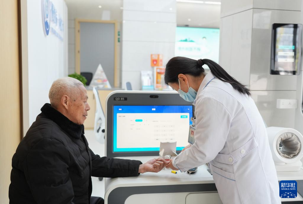 12月16日,医务人员在建德市梅城镇宝华洲未来社区智慧健康站为老人测血糖。