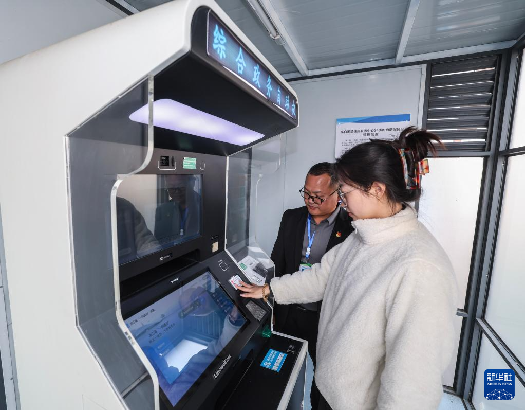 12月18日,在东白湖镇事业综合服务中心内,工作人员(左)指导村民在24小时自助服务区使用综合政务自助机。