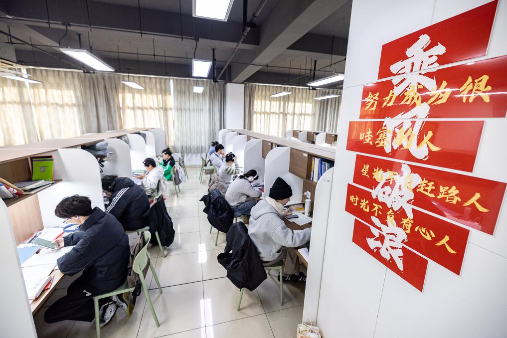 12月16日,在浙江省湖州师范学院图书馆考研自习室,考生复习备考。