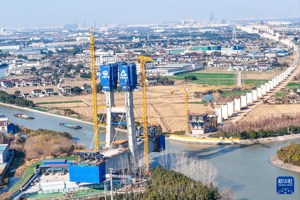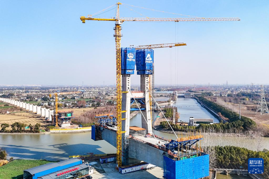 这是12月26日拍摄的通甬高铁跨张家港河斜拉桥主塔施工现场。