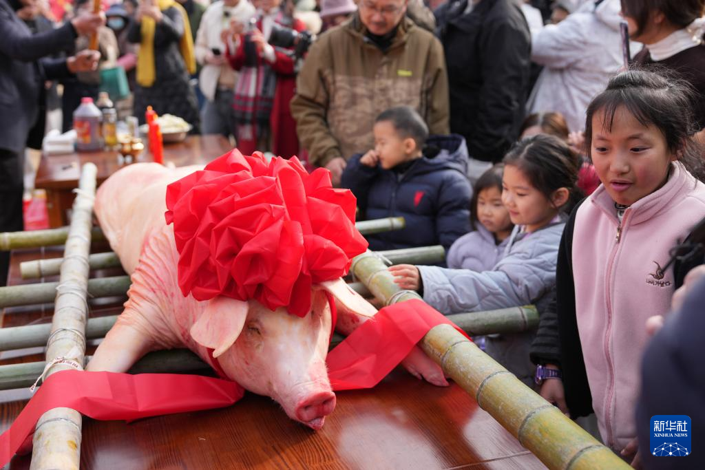 临近新年,浙江省湖州市吴兴区妙西镇“西塞山暖冬会”在龙山村泊心湾306营地举行,村民与游客一起观摩传统的杀年猪仪式,逛市集、品美食、玩游戏,体验乡村传统民俗。