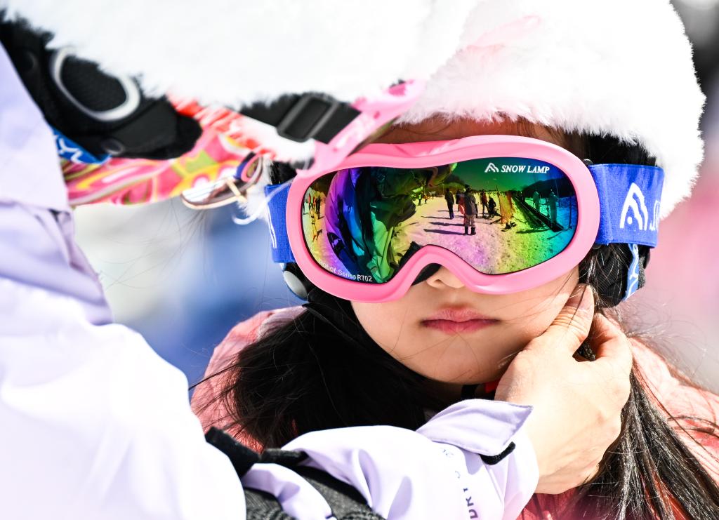 1月11日,家长在江苏省句容市宝华山滑雪场给小朋友整理装备。