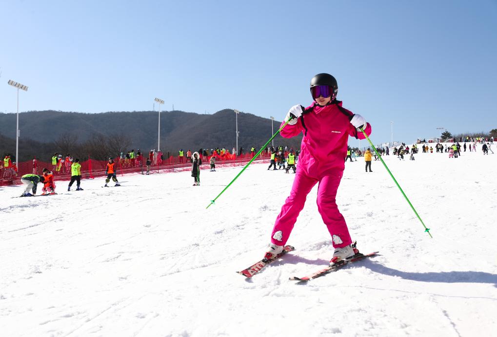 1月11日,小朋友在江苏省句容市宝华山滑雪场滑雪。