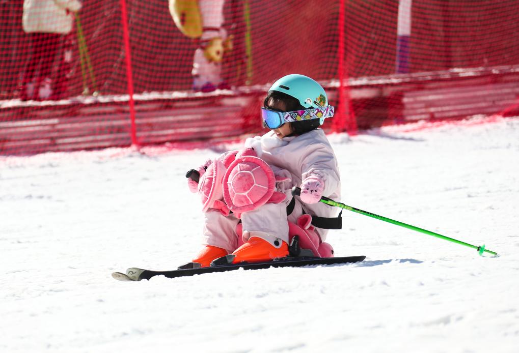 1月11日,小朋友在江苏省句容市宝华山滑雪场享受冰雪乐趣。
