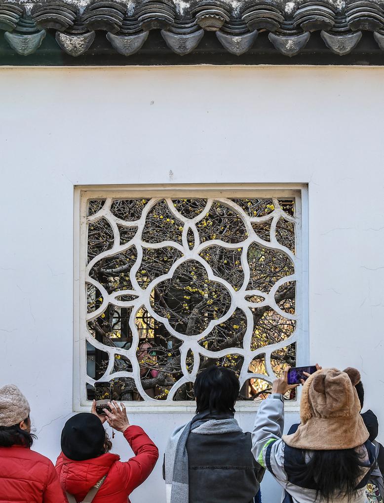 1月11日,游人在梅花绽放的南京瞻园拍照。