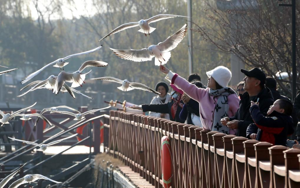 1月10日,游客在江苏省苏州市吴中区光福镇冲山村的太湖旁观赏红嘴鸥。