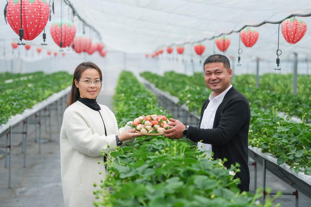 1月17日,尚田街道拾光牧田草莓园负责人杜永达(右)、何丹红夫妇展示刚采摘的草莓。