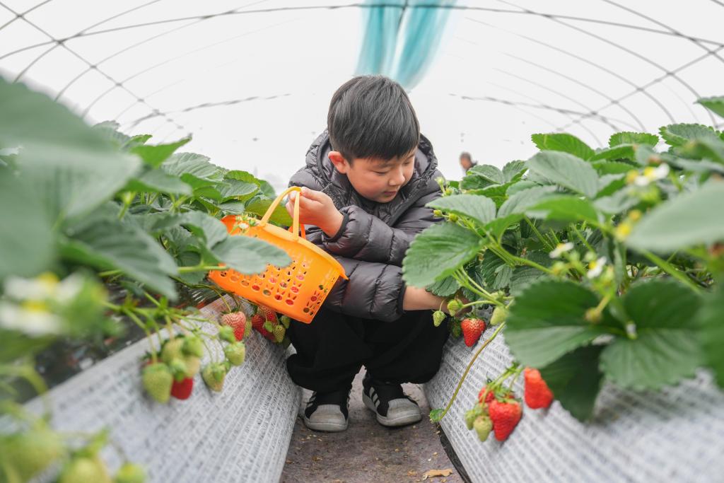1月17日,游客在尚田街道尚东村的一个草莓种植园采摘草莓。