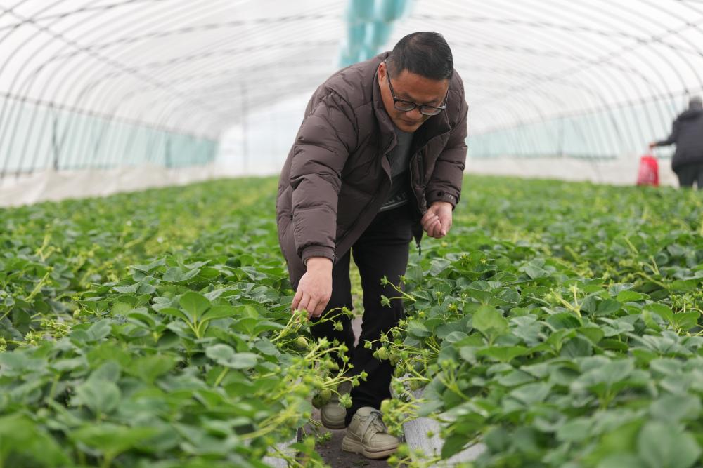 1月17日,尚田街道尚东村的草莓果农袁敏在种植园检查草莓长势。