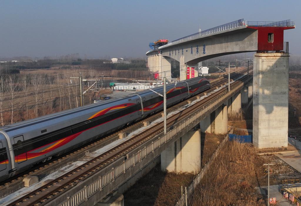 1月16日,行驶在京沪高铁线上的列车穿过沪宁合高铁跨京沪高铁立交特大桥201.5米预应力混凝土T构转体梁(无人机照片)。