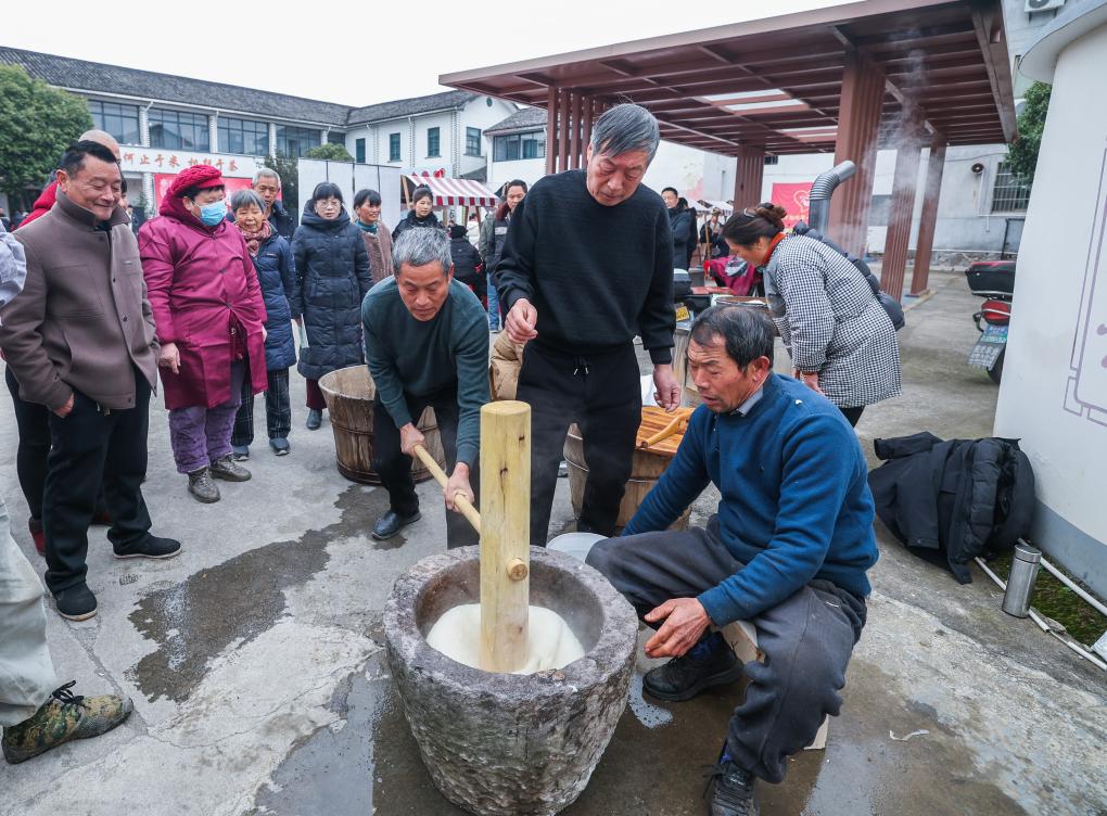 1月23日,村民们在东白湖镇乡村年味大集现场打麻糍。