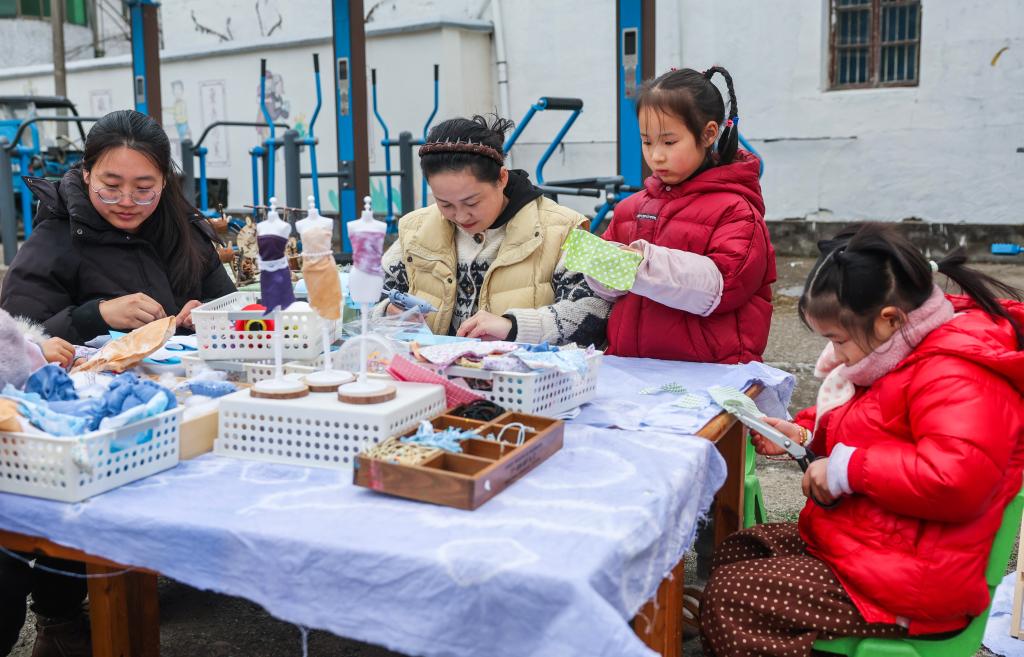 1月23日,东白湖镇元培幼儿园的老师带着孩子们在乡村年味大集上做手工。
