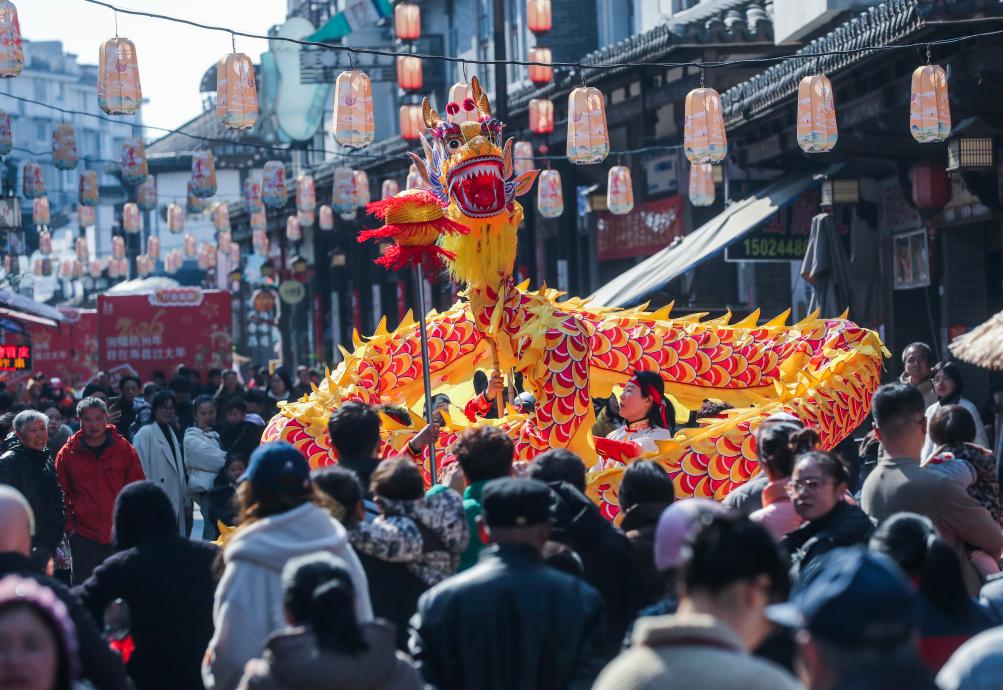 2月8日,游客在寿昌古镇老街上观看传统舞龙表演。