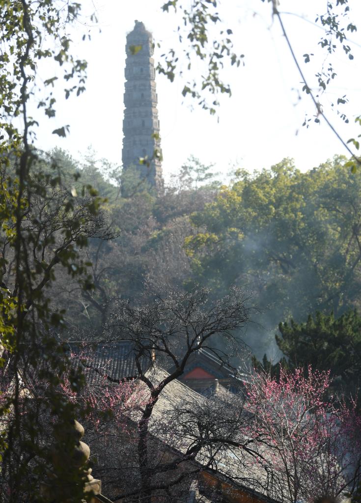 隋梅与古寺相映成趣(2月9日摄)。