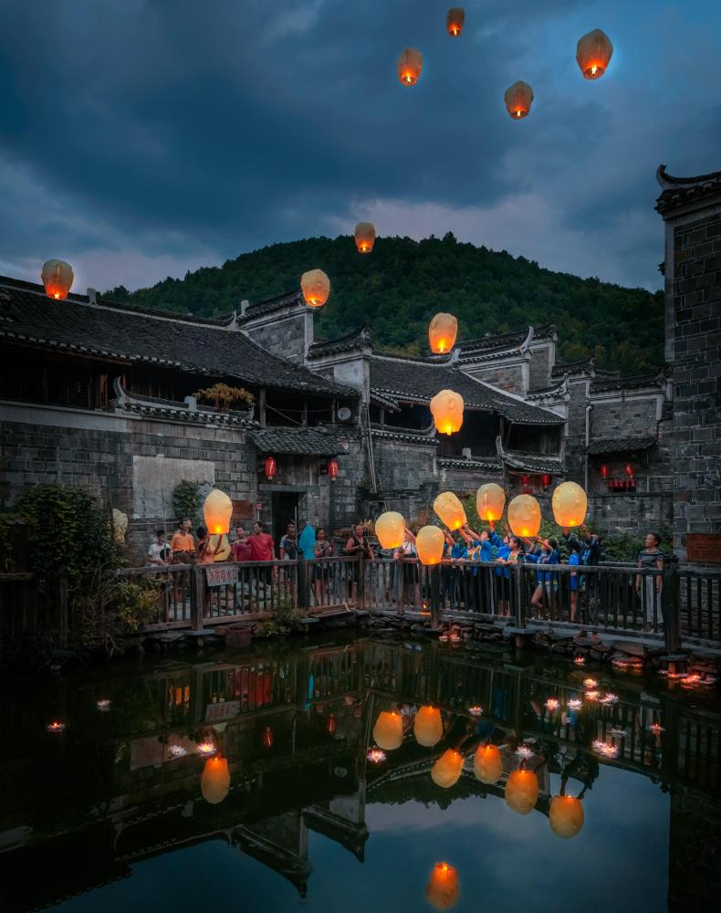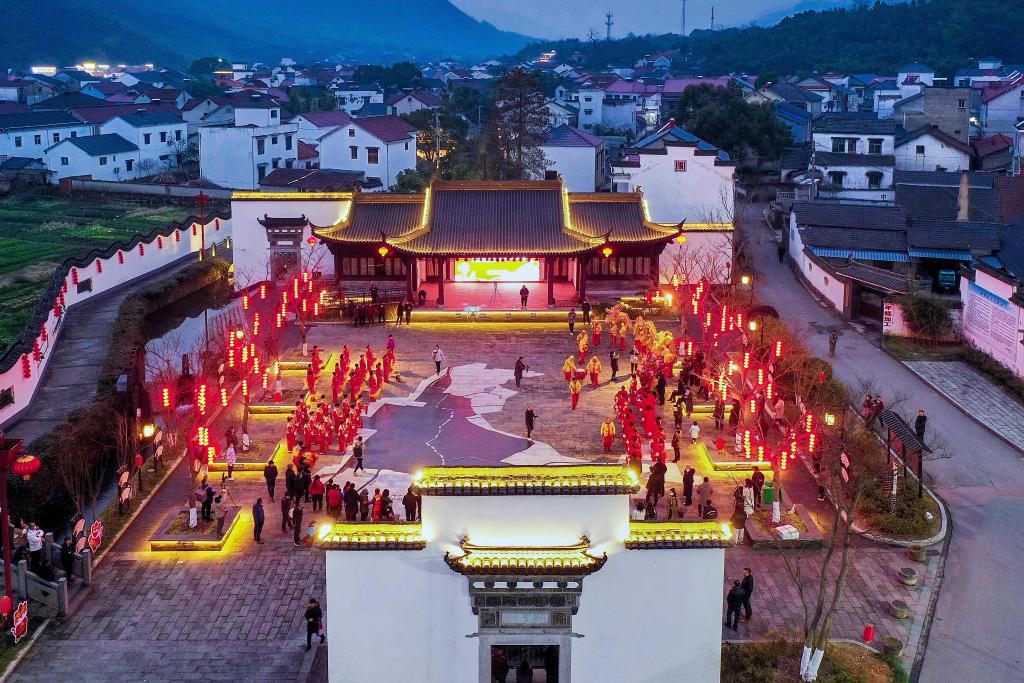 ↑在浙江省湖州市安吉县鄣吴镇鄣吴村八府广场,当地群众举办元宵节非遗踩街活动(无人机照片,2022年2月14日摄)。鄣吴村入选第三批中国传统村落,保存有丰富的明清时期古建筑。