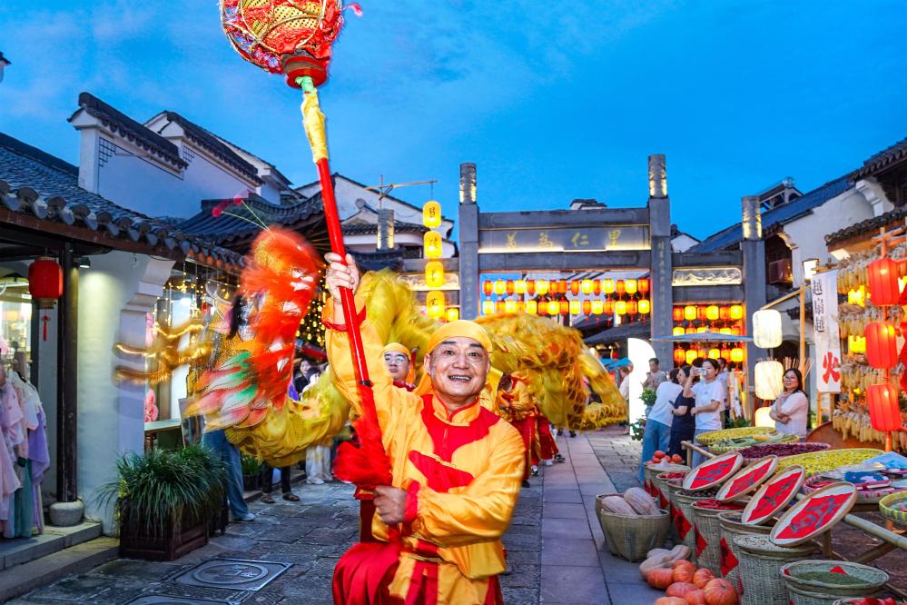 ↑浙江省湖州市安吉县鄣吴镇鄣吴村,人们舞动鄣吴金龙在归仁里老街进行非遗踩街庆丰收活动(2025年9月12日摄)。鄣吴村入选第三批中国传统村落,保存有丰富的明清时期古建筑。