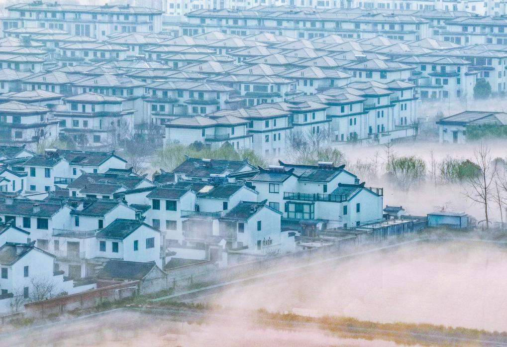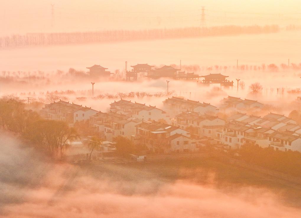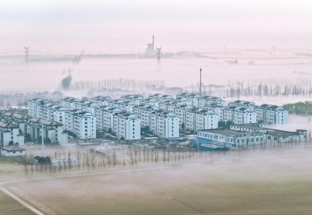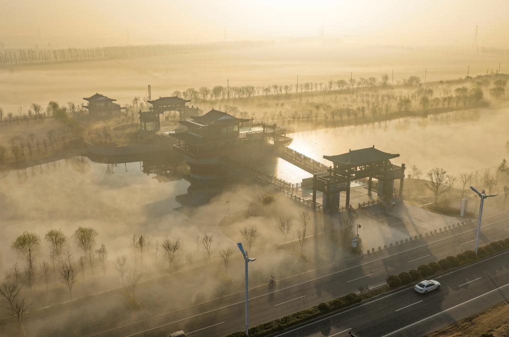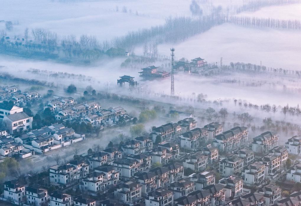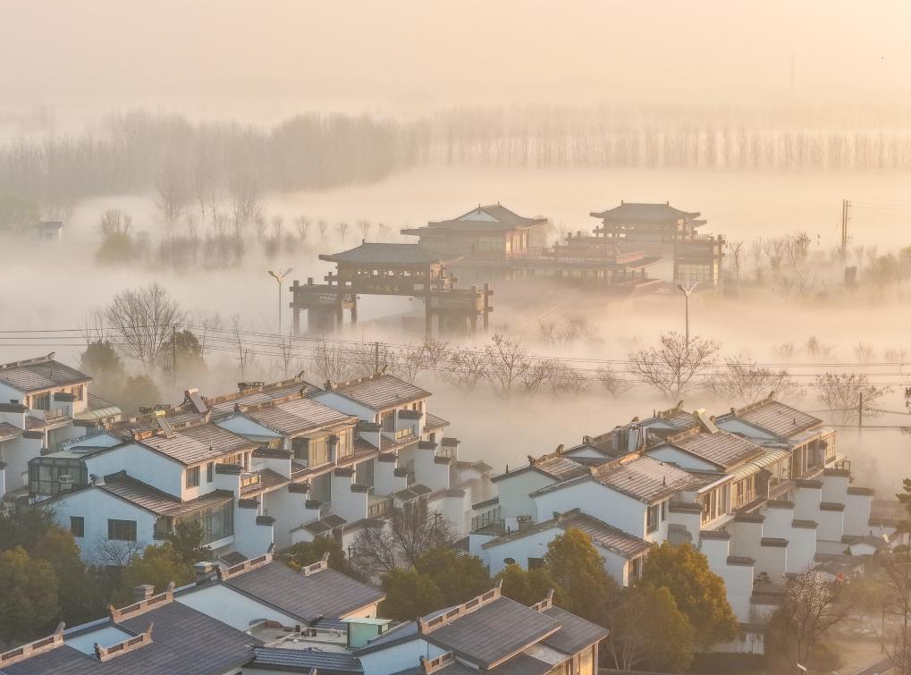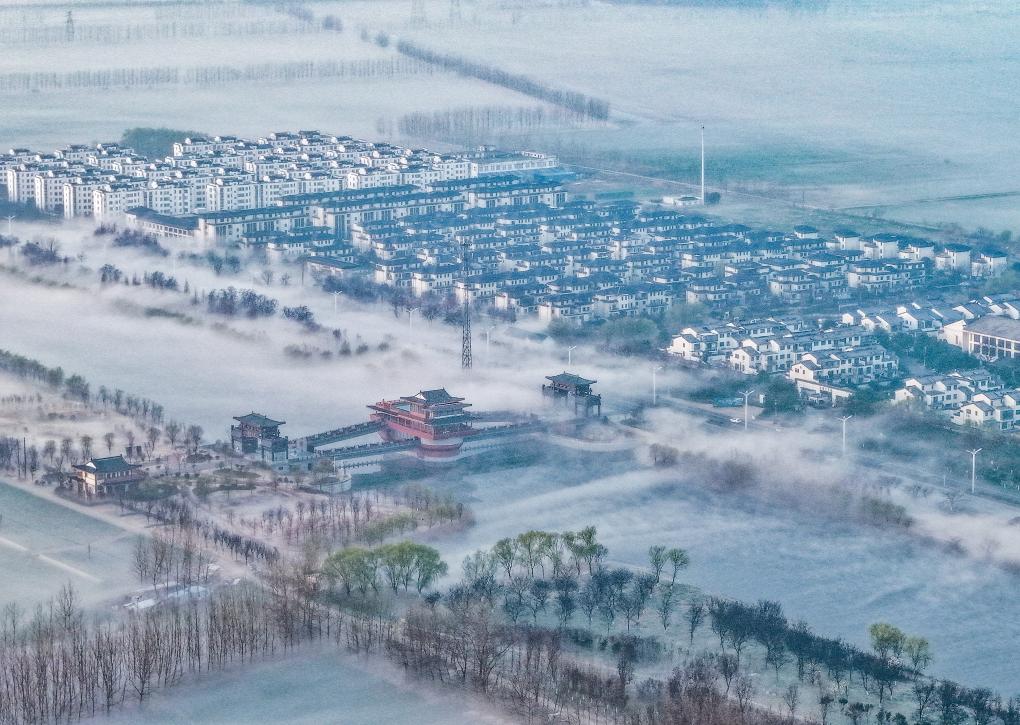 近日,江苏省宿迁市泗洪县石集乡晨雾缭绕,薄雾轻纱笼罩水面,古汴河畔如诗如画。