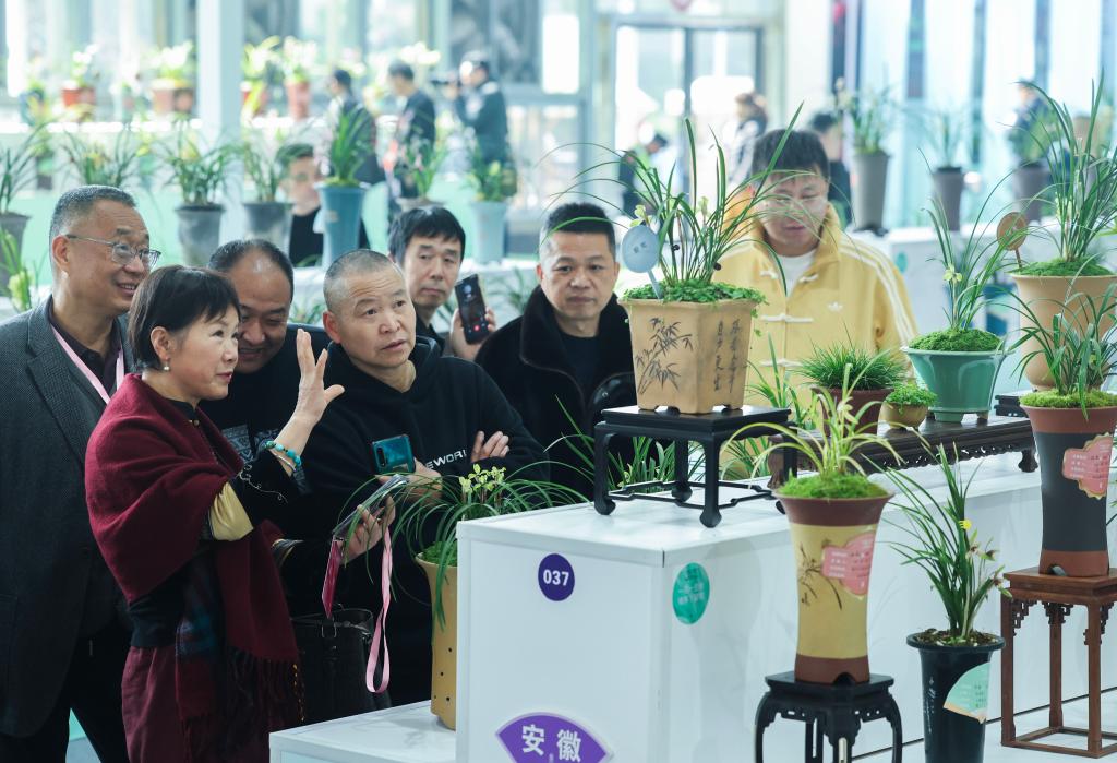 3月13日,观众在春兰大集现场观赏获得金奖的兰花。