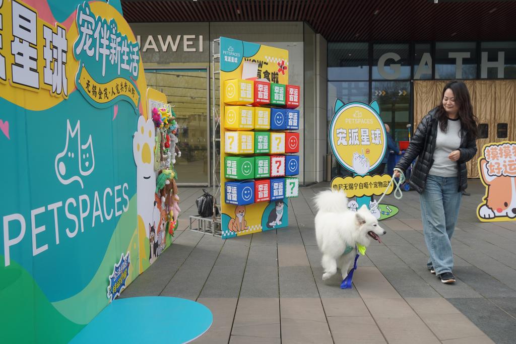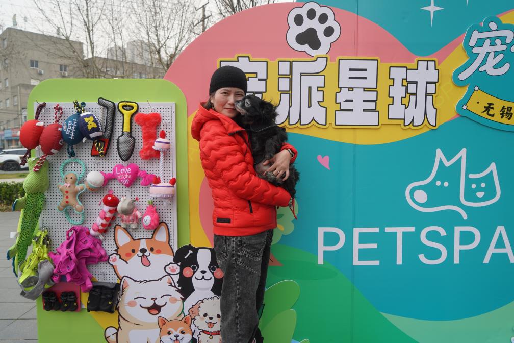 3月15日,在无锡市运河汇街区,一位女士抱着宠物狗在活动展板前打卡。