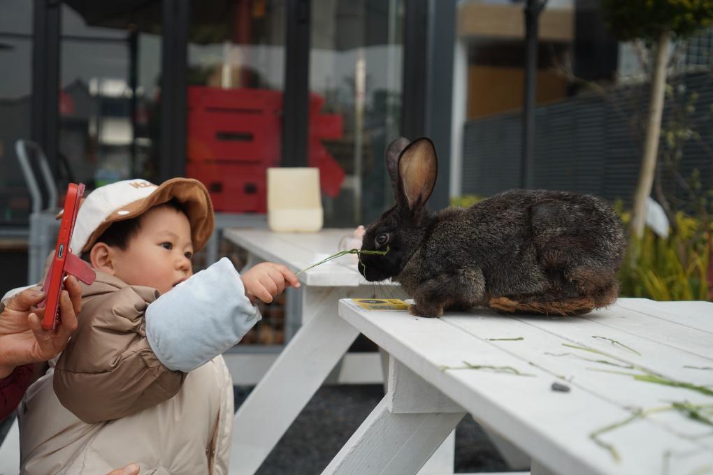 3月15日,在无锡市运河汇街区,一位小朋友在喂食商家饲养的宠物兔。