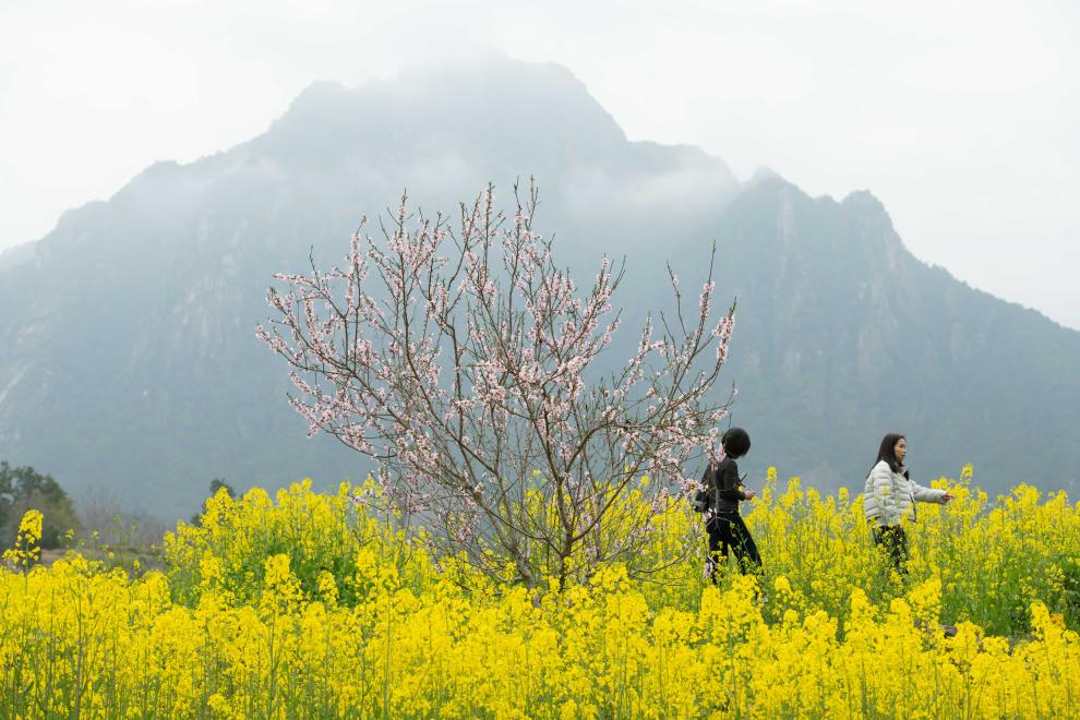 3月22日,游客在幸福村梅干岭油菜花田赏花。