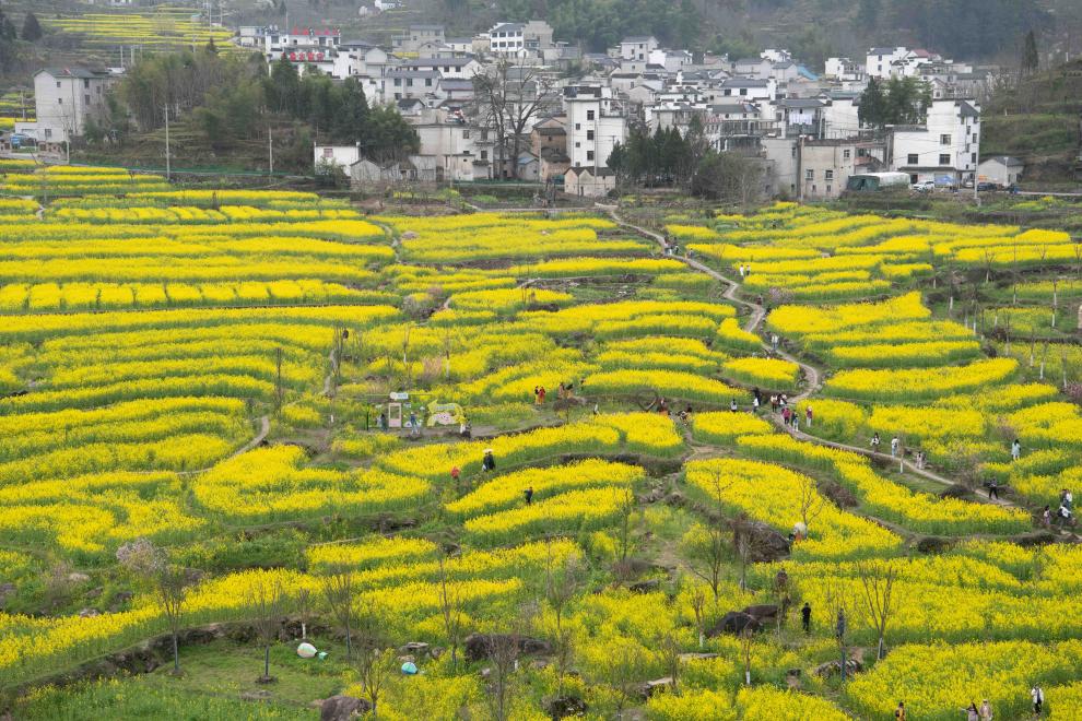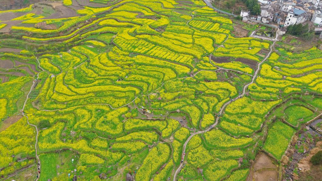 眼下,安徽省宣城市绩溪县家朋乡幸福村的油菜花田进入盛花期,大批游客来此踏青赏花。