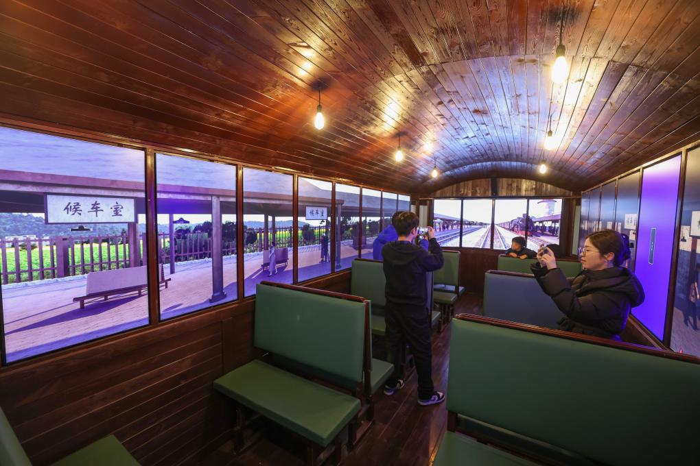 3月24日,游客在嘉兴市南湖区“翼时空·嘉兴1921”复古街区时光列车车厢里拍照打卡。
