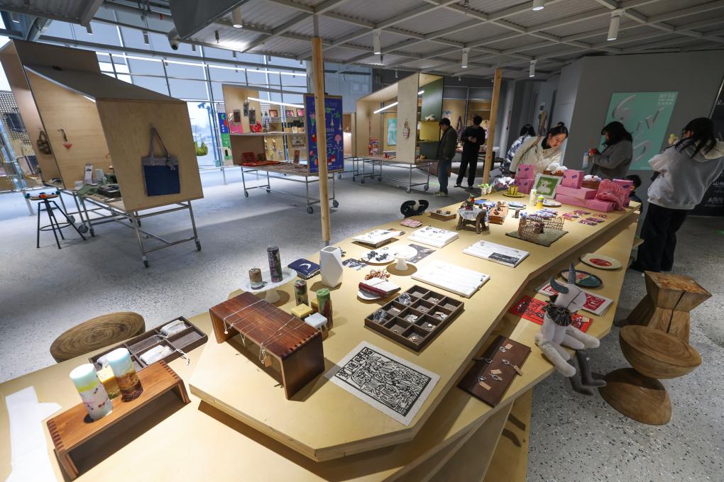 3月24日,游客在嘉兴市南湖区“翼时空·嘉兴1921”的木制手作空间内体验。
