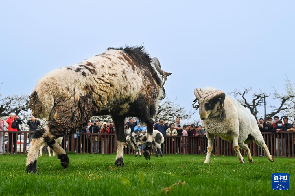 3月30日,游客在砀山县梨树王风景区观看斗羊比赛。