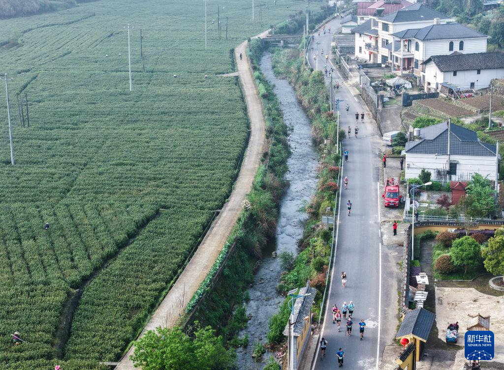4月19日,选手们奔跑在乡村田野间(无人机照片)。