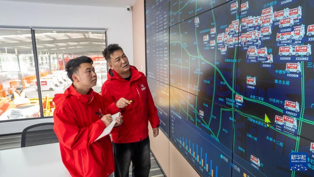 4月18日,在江苏省南通市通州区川姜镇智能无人驾驶专用枢纽,工作人员通过智慧大屏了解无人车运行状况。
