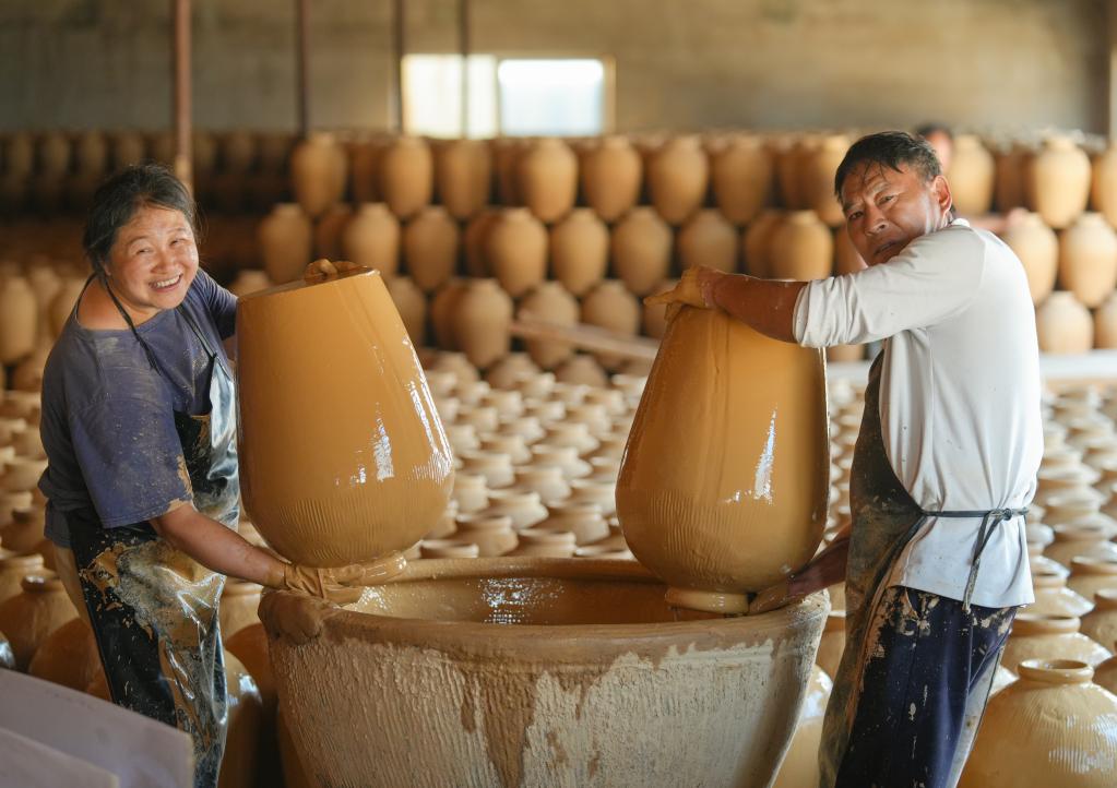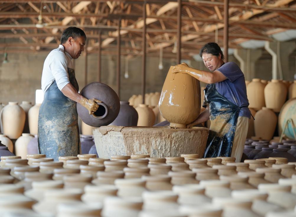 近日,在浙江省湖州市长兴县小浦镇高地村一处手工作坊内,工人们在赶制一批酒缸、泡菜坛,从揉泥塑形到修坯晾晒有序推进,让传统老手艺产销两旺。