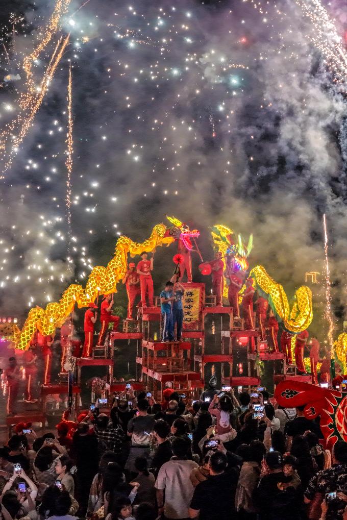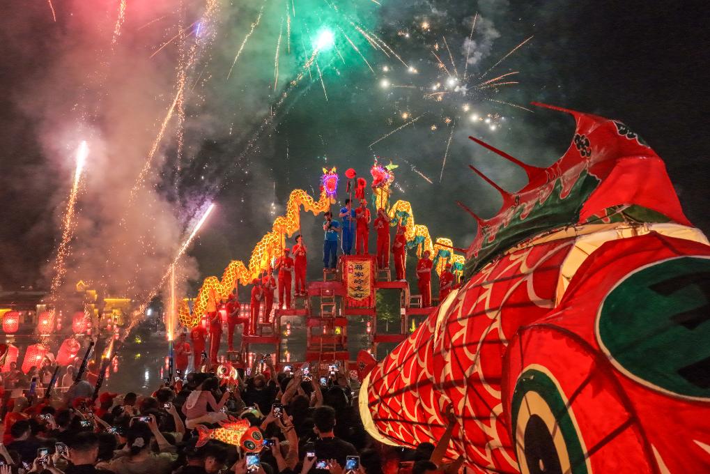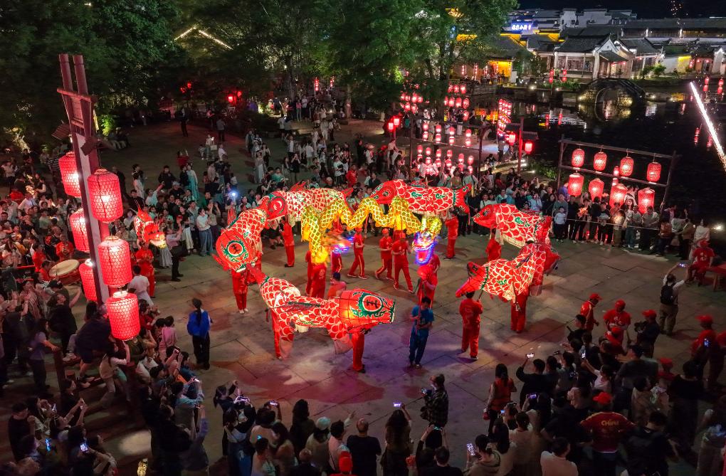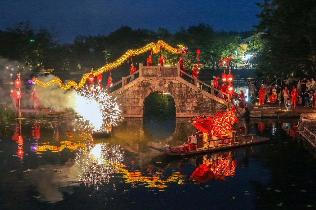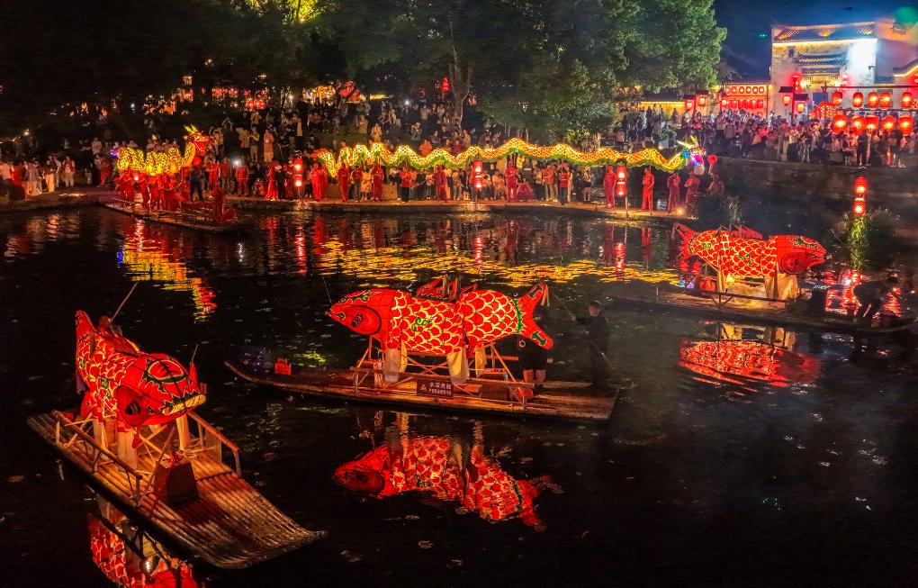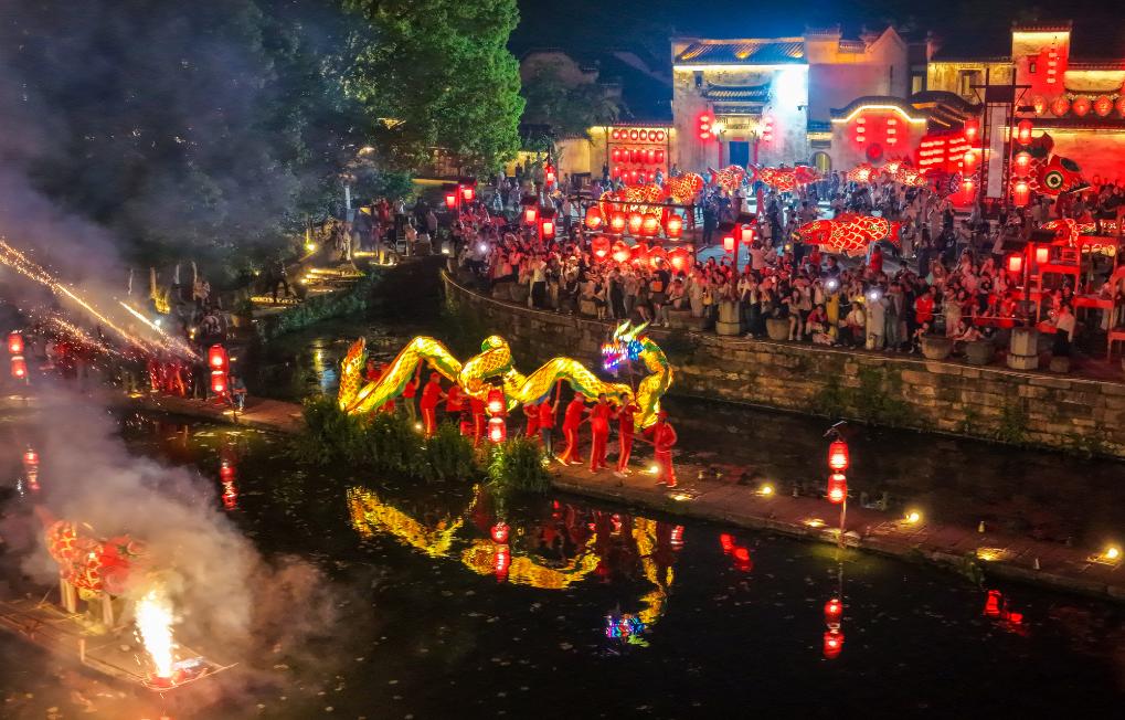 安徽黄山:“鱼龙共舞”点亮古村夜色