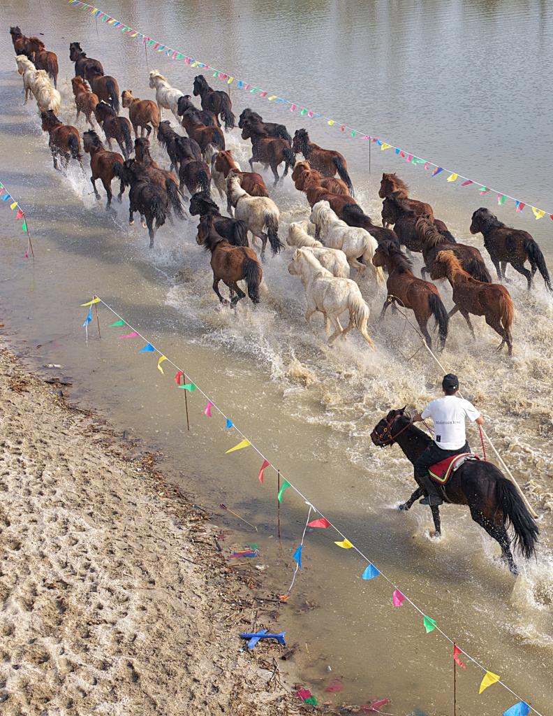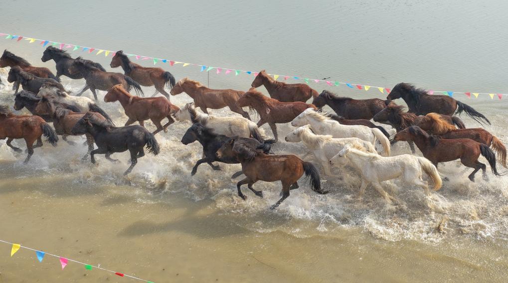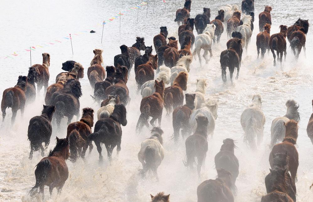 2月12日,骏马在南通森林野生动物园踏水驰骋(无人机照片)。