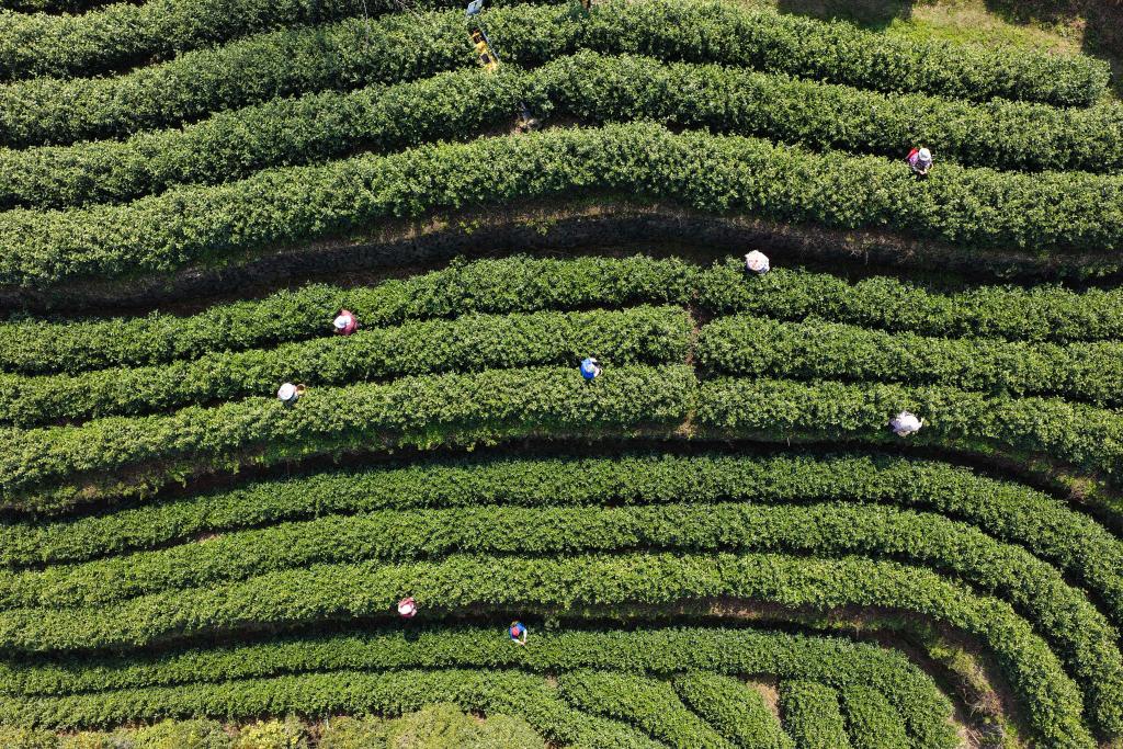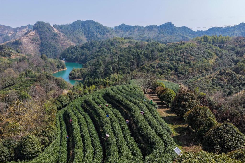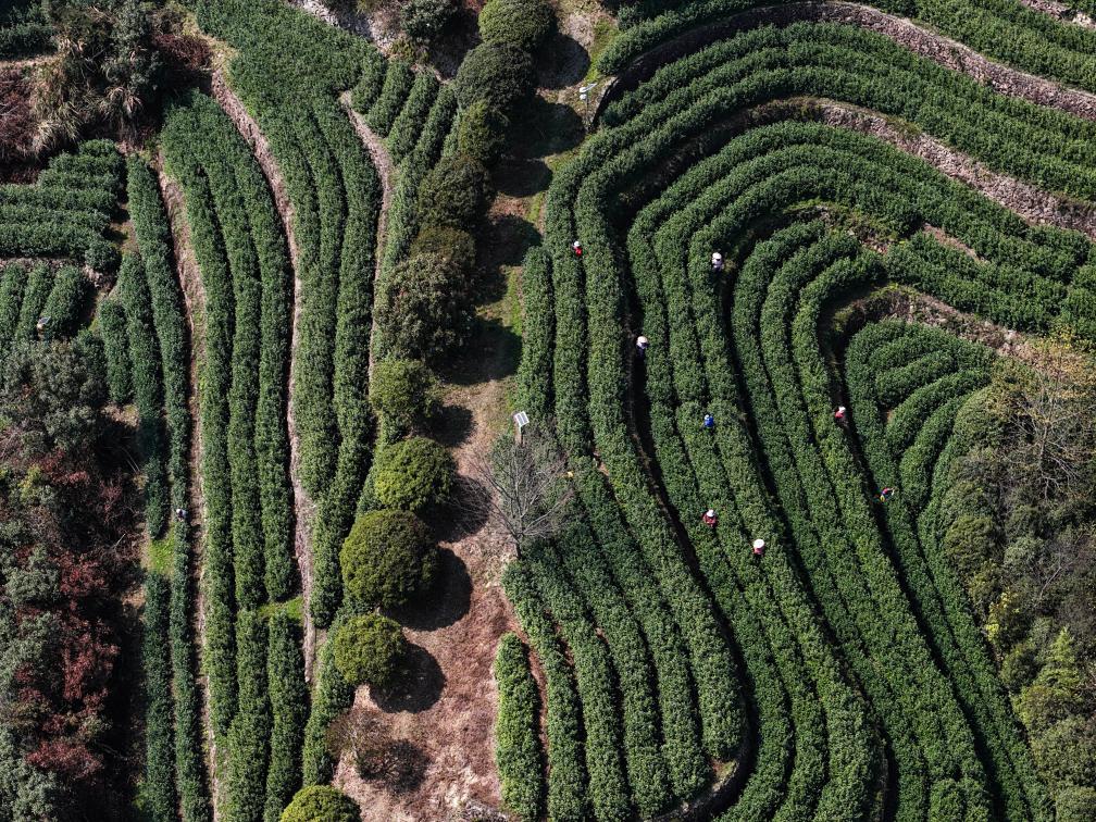 3月10日,在武义县更香有机茶园内,采茶工在采摘今年首批春茶(无人机照片)。