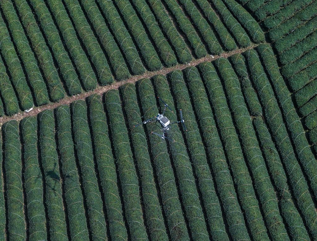 3月10日,农用无人机在武义熟水茶业有限公司的茶园内施肥(无人机照片)。