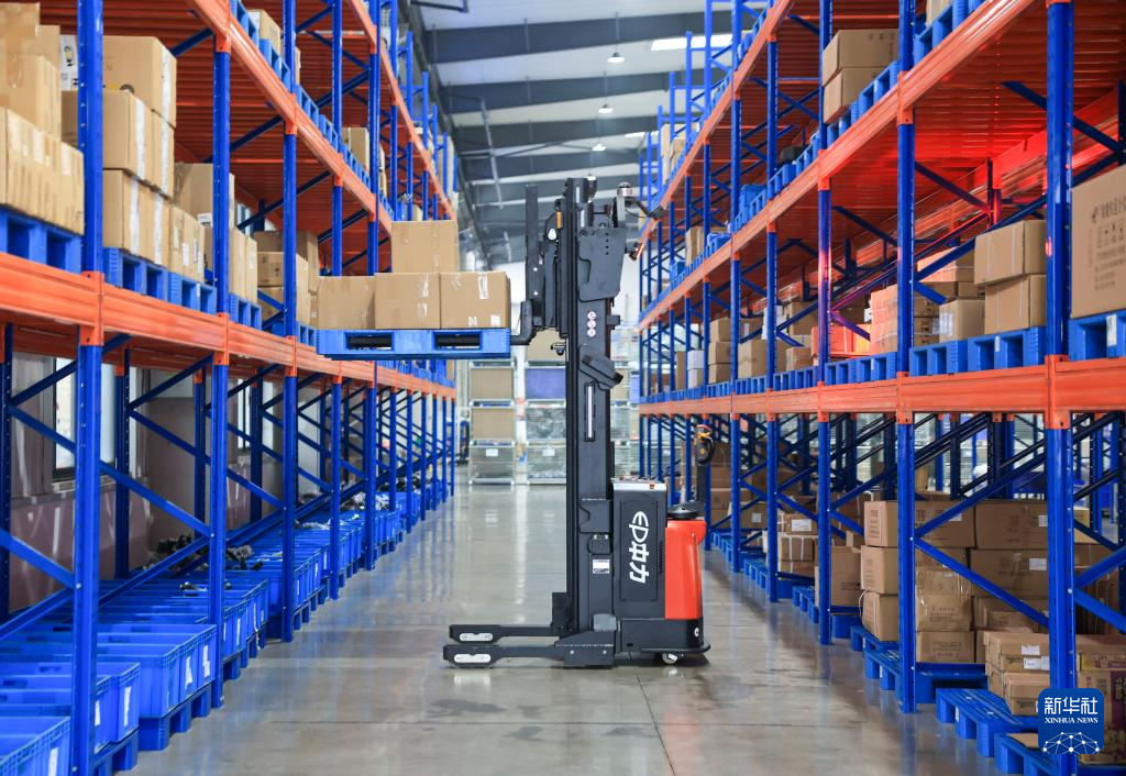 3月16日,在江苏江阴—靖江工业园区江苏中力叉车有限公司仓储区,智能堆高式机器人对货物进行堆垛。