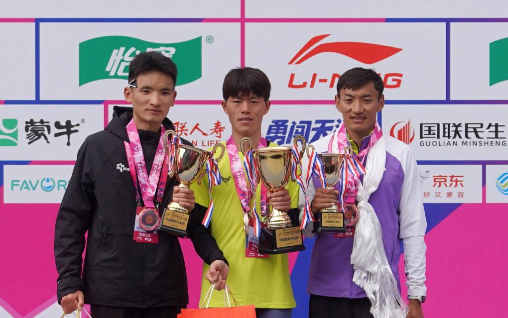 3月22日,男子国内组第一名毛金虎(中)、第二名丰配友(左)和第三名索朗才仁在领奖台上合影。