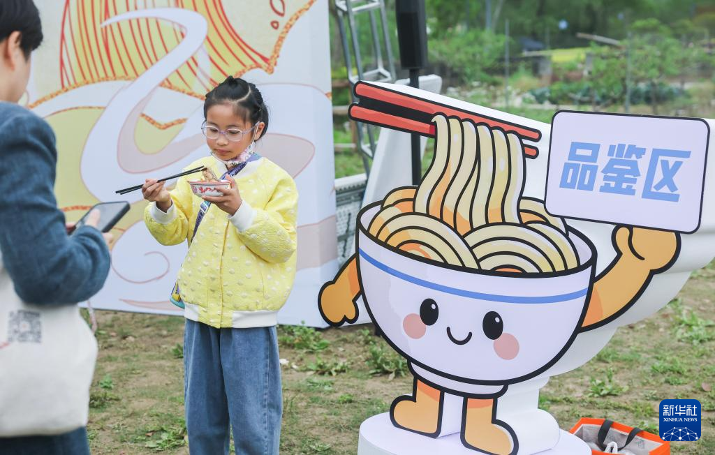 4月11日,一名小朋友在活动现场品尝刚刚烹制的桐乡面。
