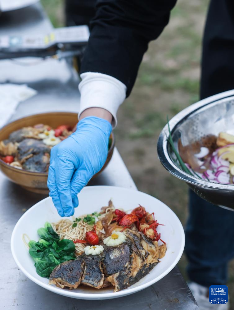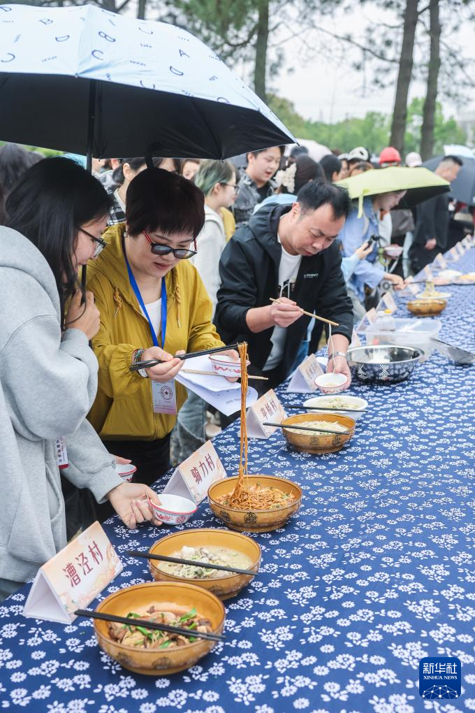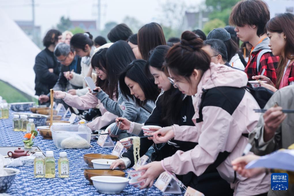 4月11日,游客和当地百姓在活动现场品尝刚刚烹制的桐乡面。
