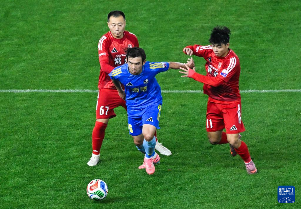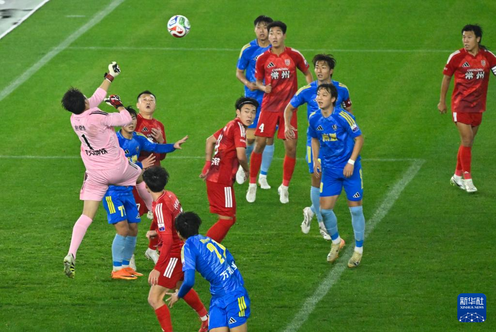 4月11日,常州队门将别奇修(左)在比赛中扑救。