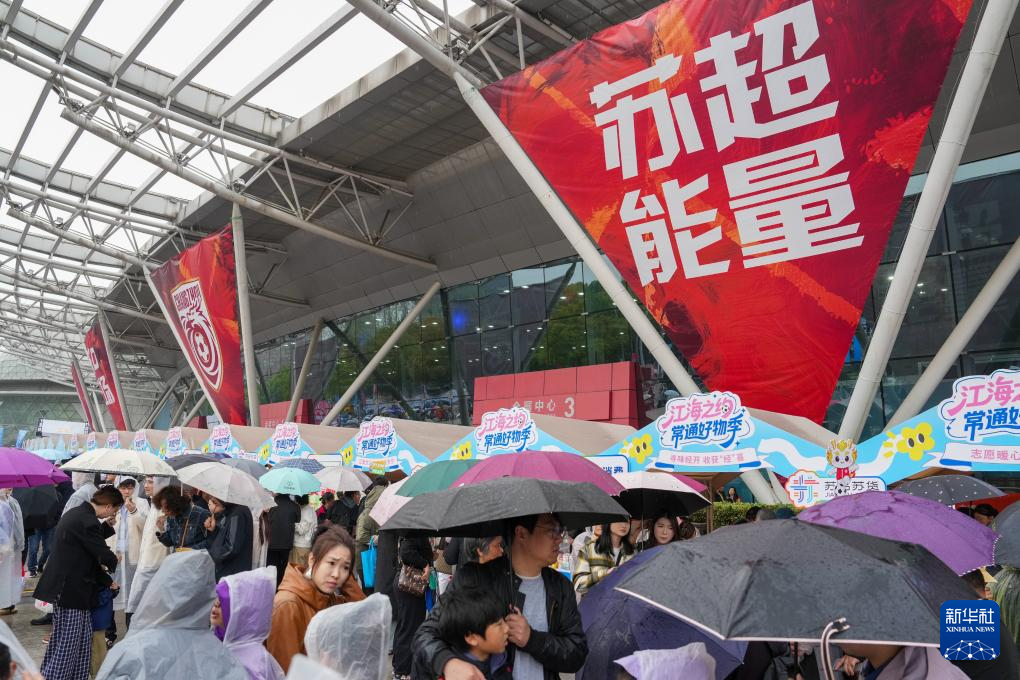 4月11日,观众在常州奥体中心的“苏超”市集休闲游玩。